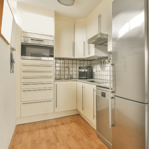 Pour des petites cuisines (kitchenettes), il est conseillé d’utiliser des lames fines et courtes. Pour conserver la solidité et la stabilité des lames, l’utilisation de lames de parquet contrecollé multifrise est recommandée.