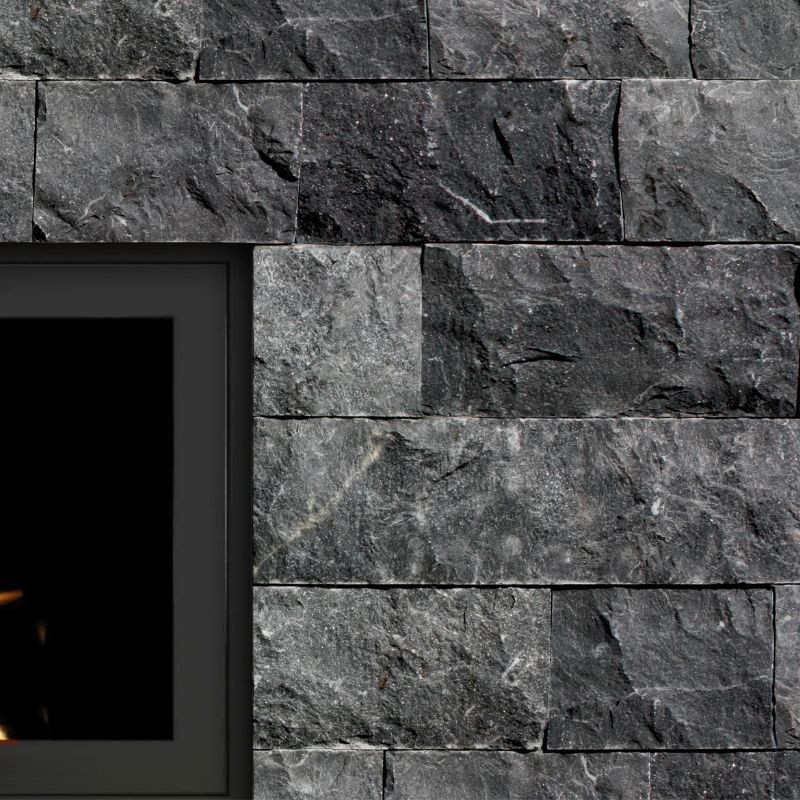Complétez parfaitement vos murs avec l'élégance naturelle de l'angle de parement travertin noir, face éclatée.