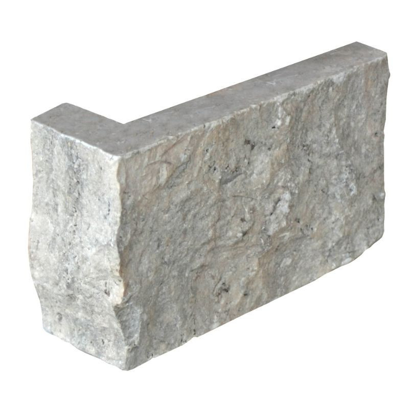 Complétez parfaitement vos murs avec l'élégance naturelle de l'angle de parement travertin Silver, face éclatée.
