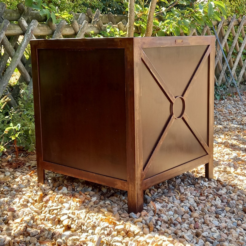 Découvrez ce remarquable bac d'orangerie (avec croisillons) qui évoque le charme typique de la fin du XIXe siècle. Que ce soit dans un appartement, une maison, un jardin ou sur une terrasse, ce bac de taille moyenne offre une dimension verticale et décorative à votre extérieur. Constitué d'un cadre en acier rouillé, ce bac d'orangerie résiste aux intempéries et aux changements de température, le rendant parfaitement adapté pour un positionnement en extérieur sans craindre les détériorations. Toutefois, en fonction des végétaux choisis et du climat hivernal, il peut être préférable de protéger les bacs durant les périodes froides. Cette création est fabriquée à partir d'acier très épais, ce qui lui assure une longévité optimale. La finition rouille de ce bac à oranger confère un aspect vieilli, lui conférant une authenticité qui ajoute du charme à votre aménagement extérieur. Ce produit allie un design rustique à une fonctionnalité élégante. Utilisez-le seul pour mettre en valeur une plante magnifique, ou combinez plusieurs bacs pour créer une harmonie dans votre jardin. Nos bacs d'orangerie avec croisillons conviennent à une grande variété de plantes, telles que les citronniers, orangers, palmiers, oliviers, buis, ifs, lauriers, hêtres, charmes, sapins, hortensias, et même les massifs floraux. Associez ce bac à oranger avec des modèles de plus grande taille pour accueillir un arbre fruitier par exemple. À titre informatif :- Tous nos bacs sont fournis avec un revêtement plastique alvéolé à l'intérieur, la terre n'est pas en contact direct avec le métal.