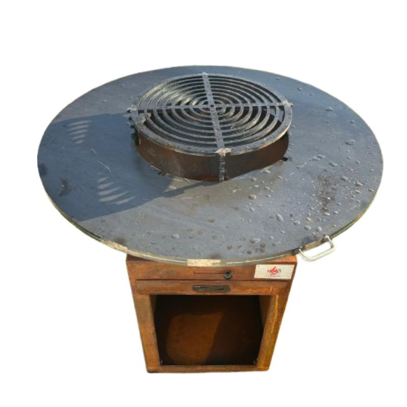 Ce brasero est un véritable indispensable pour une cuisine extérieure à la fois moderne et conviviale. Fabriqué en France à partir d'acier COR-TEN de 3 mm d'épaisseur, ce brasero est exceptionnellement résistant. La plaque de cuisson de ce brasero mesure 6 mm d'épaisseur pour le diamètre 60 et 10 mm pour toutes les tailles supérieurs, Ce brasero dispose d'un système d'arrivée d'air innovant qui facilite l'allumage et accélère la montée en température de l'anneau de cuisson. Il dispose également d'un tiroir à cendres intégré dans son socle pour faciliter le nettoyage du brasero après utilisation. Les socles proposés disposent chacun de larges espaces de rangement qui vous permettent de stocker vos bûches à portée de main. Ces braseros vous permettent d'accueillir entre 6 et 28 convives, en fonction du diamètre de plaque choisi. Découvrez aussi notre second modèle de brasero en corten avec sa grille de cuisson surélevée intégrée.Comment entretenir votre brasero en corten ?