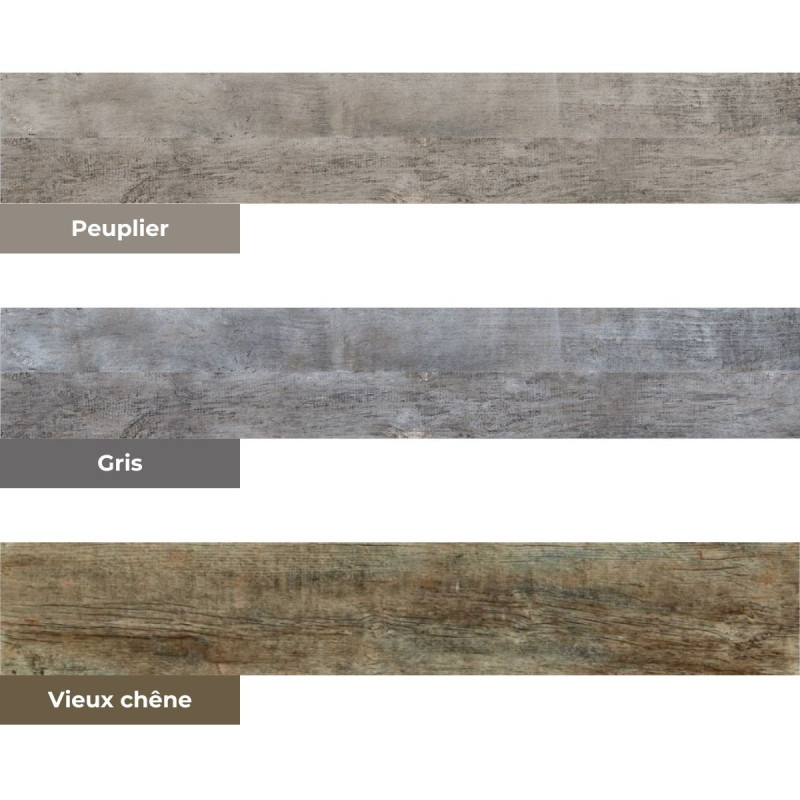 - Résistance à l'usure : Gris, Vieux Chêne : PEI 4 | Peuplier : PEI 5 (EN ISO 10545-7)