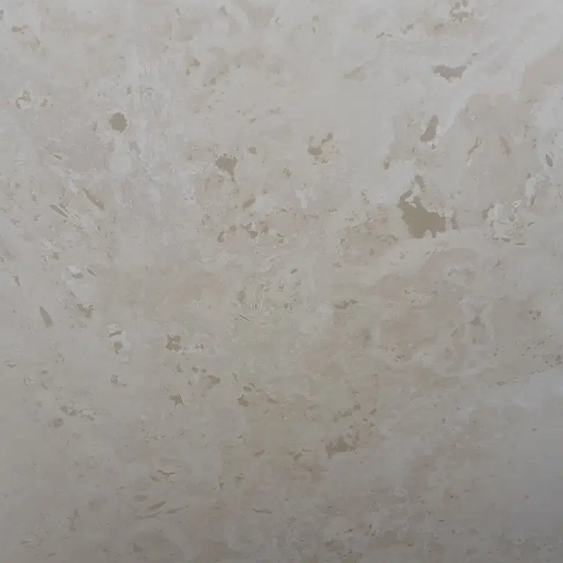 Rigoureusement sélectionné, ce dallage en travertin adouci rebouché provient de carrières turques. À la différence d’un carrelage effet pierre, il s’agit ici d’une pierre naturelle authentique. En effet, le bloc de pierre est directement taillé afin d’en extraire les dalles. Sa finition adoucie rebouchée garantit une teinte beige clair, avec peu de variations de couleur entre les dalles. De plus, les trous et aspérités¹ naturellement présents sont rebouchés, offrant ainsi une surface lisse et homogène.