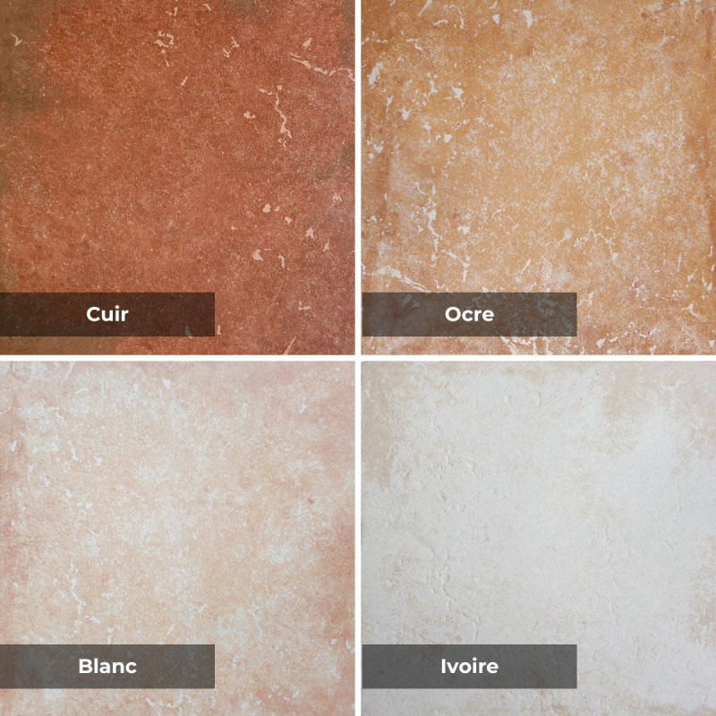 Le carrelage Pont du Gard se décline en quatre coloris. Vous pouvez ainsi choisir entre Cuir, Blanc, Ivoire et Ocre.