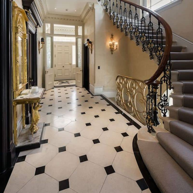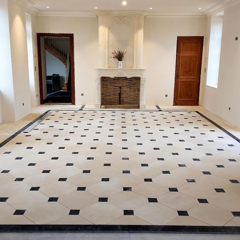 Le dallage à cabochons est un modèle intemporel, apprécié pour son élégance classique et sa capacité à créer un effet visuel unique et rythmé dans les espaces où il est installé. Ce motif de pose se compose de grandes dalles en pierre, disposées de manière régulière, chacune encadrée par des cabochons en granit noir, créant ainsi un subtil contraste entre la lumière douce de la pierre de Combe Brune et la profondeur intense du granit noir poli ou brossé. Ce motif classique est particulièrement prisé dans les demeures de caractère ou les projets de rénovation visant à recréer un style authentique. Utilisé principalement en intérieur, ce dallage peut être installé dans de nombreuses pièces de la maison telles que le salon, la salle à manger, les couloirs ou même les entrées, où il confère une atmosphère élégante et sophistiquée. Le dallage à cabochons n'est pas seulement un choix esthétique : il est aussi synonyme de savoir-faire traditionnel. Ce modèle apporte du cachet à tout intérieur, en créant une ambiance raffinée et graphique.Comment poser et entretenir un dallage à cabochons ?
