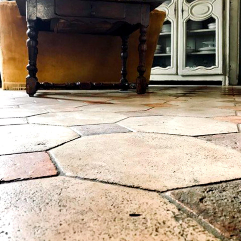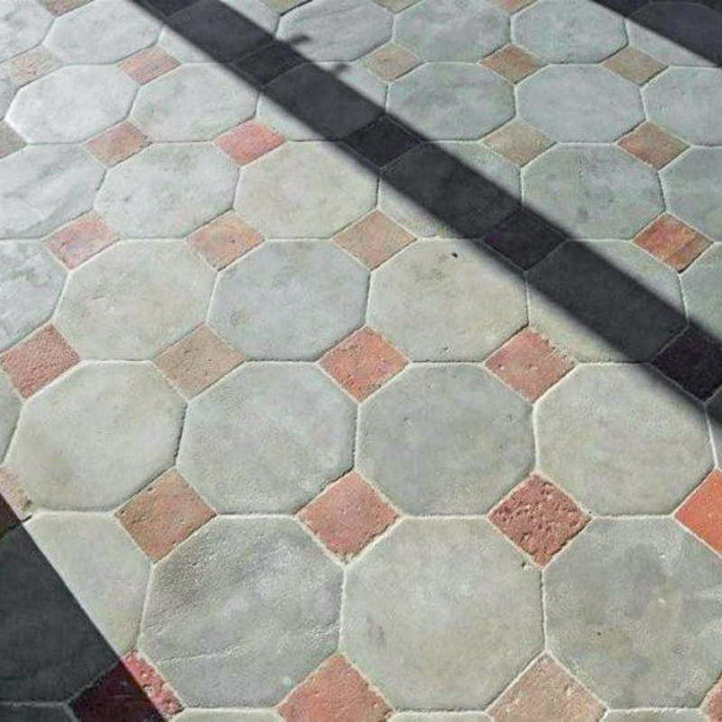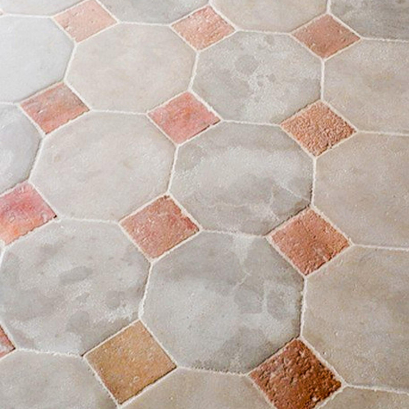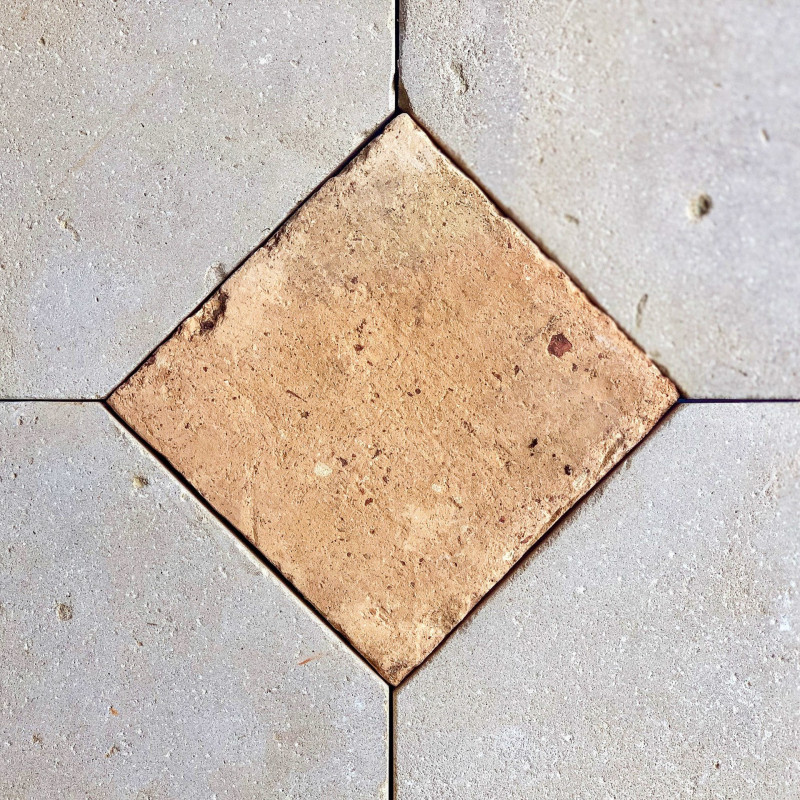 Fabriqué à partir de pierre naturelle extraite d’une carrière située en Turquie, ce dallage à cabochons en travertin vous assure un savoir-faire authentique. La pierre naturelle ne subit aucune opération de cuisson. Leurs compositions en pierres naturelles ont pour avantages de vous assurer un sol durable doté d’une grande résistance aux chocs et à l’usure. Répondant aux normes R 10 (inclinaison du sol allant de 10° à 19°) et R 11 (inclinaison du sol allant de 19° à 27°), ces classifications garantissent l’adhérence de votre travertin. Ces normes carrelage antidérapantes sont de réels gages de sécurité pour éviter les malencontreuses glissades dans vos pièces humides. Les cabochons sont réalisés dans des tomettes du XVIIIᵉ siècle. Les dalles octogonales quant à elles sont en pierres naturelles de calcaire avec une surface patinée et brossée. Celle-ci a été vieillie en surface ainsi que sur les arêtes, qui sont également épaufrés1. Les aspérités2 de la pierre naturelle de calcaire apportent un cachet authentique indéniable à ce dallage. Plus rare que les cabochons noirs, les cabochons en terre cuite confèrent un charme unique à ce dallage. Associés aux dalles généralement de coloris beige / blanc, les couleurs orangées de ce dallage sont semblables à celles présentes dans les maisons du sud de la France. Cette superbe réédition de dallage à cabochons est un modèle classique du XVIIIᵉ siècle. On trouve fréquemment ce type de sol avec le cabochon en terre cuite dans les châteaux, les maisons bourgeoises et les églises, en particulier dans le sud de la France, dans le Languedoc. Cuisine, salon, salle à manger ou entrée, à vous de choisir ou le placer ! De plus, ce dallage est compatible avec le chauffage au sol. Intemporel, le dallage à cabochons languedocien apporte un caractère unique à vos différents aménagements. Afin de finir la pose de votre dallage à cabochons, nous proposons de l'associer aux dalles périphériques pour le contour de votre pièce. À souligner, ce dallage est également approprié pour une utilisation en extérieur en raison de sa résistance au gel. Découvrez aussi notre dallage à cabochons noirs ainsi queQUELS SONT LES DIMENSIONS DU DALLAGE À CABOCHONS LANGUEDOCIEN ?
