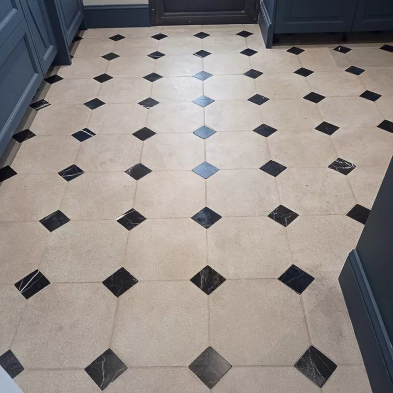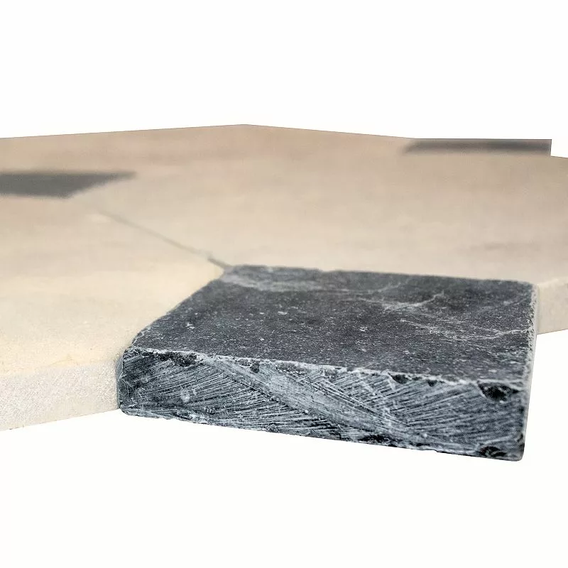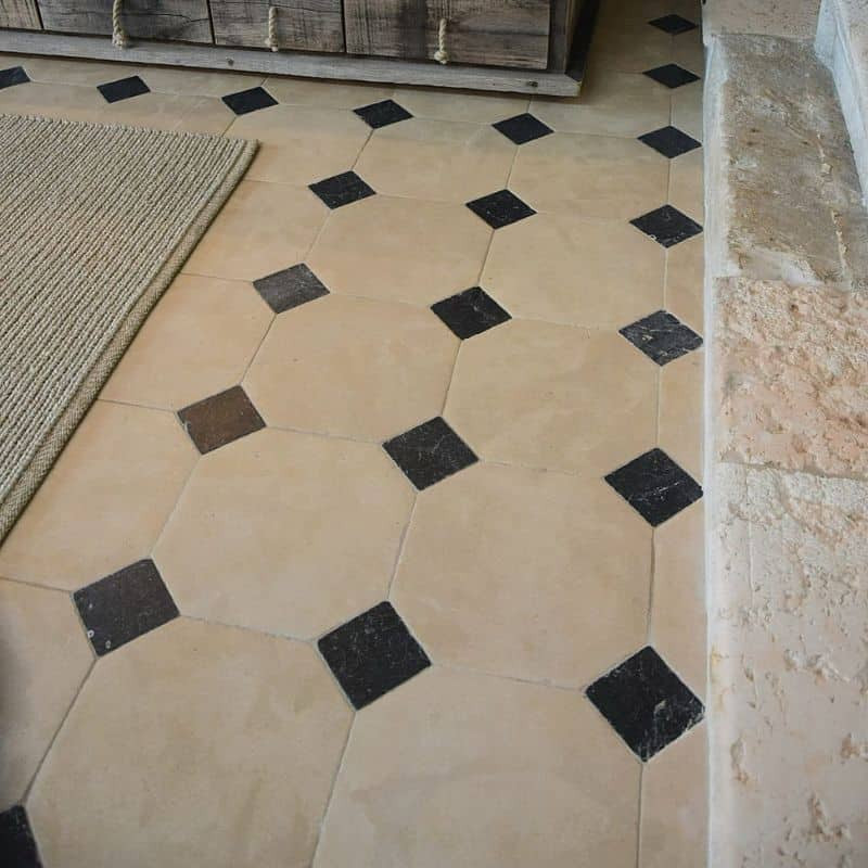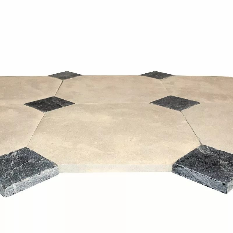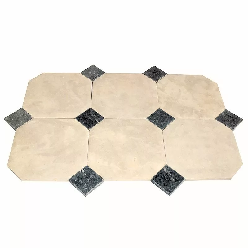 Composé d’une élégante alternance de dalles octogonales en pierre calcaire ainsi que de cabochons en marbre noir, ce dallage à cabochons Louvre saura vous conquérir. Taillé au Maroc à partir de pierre calcaire, ce dallage de qualité vous offrira de nombreux avantages grâce à sa durabilité et sa facilité d’entretien. Dotée d’une teinte beige naturelle et mise en valeur par des cabochons de marbre noir, cette dalle rustique donnera un charme ancien à votre entrée, couloir, salon ou cuisine. Distingué et élégant, ce dallage offre un cachet ancien à votre intérieur tout en se rapprochant de l’authenticité des somptueux dallages d’antan. De plus, il est compatible avec le chauffage au sol. À souligner, ce dallage est également approprié pour une utilisation en extérieur en raison de sa résistance au gel. Amoureux des dallages à cabochons ? Nous vous proposons également le dallage à cabochons en travertin ainsi que le dallage à cabochon en pierre naturelle du Nivernais !