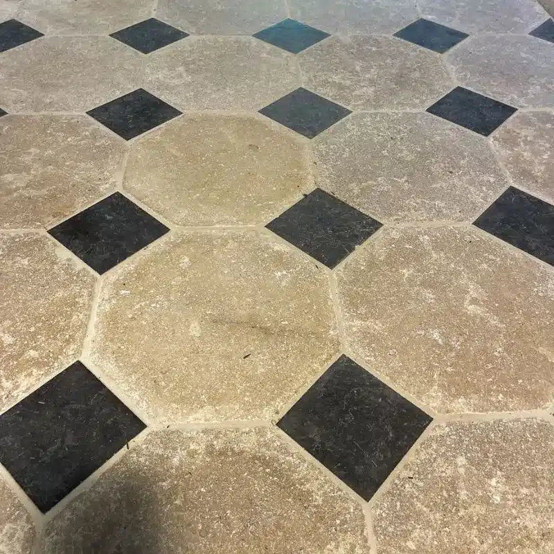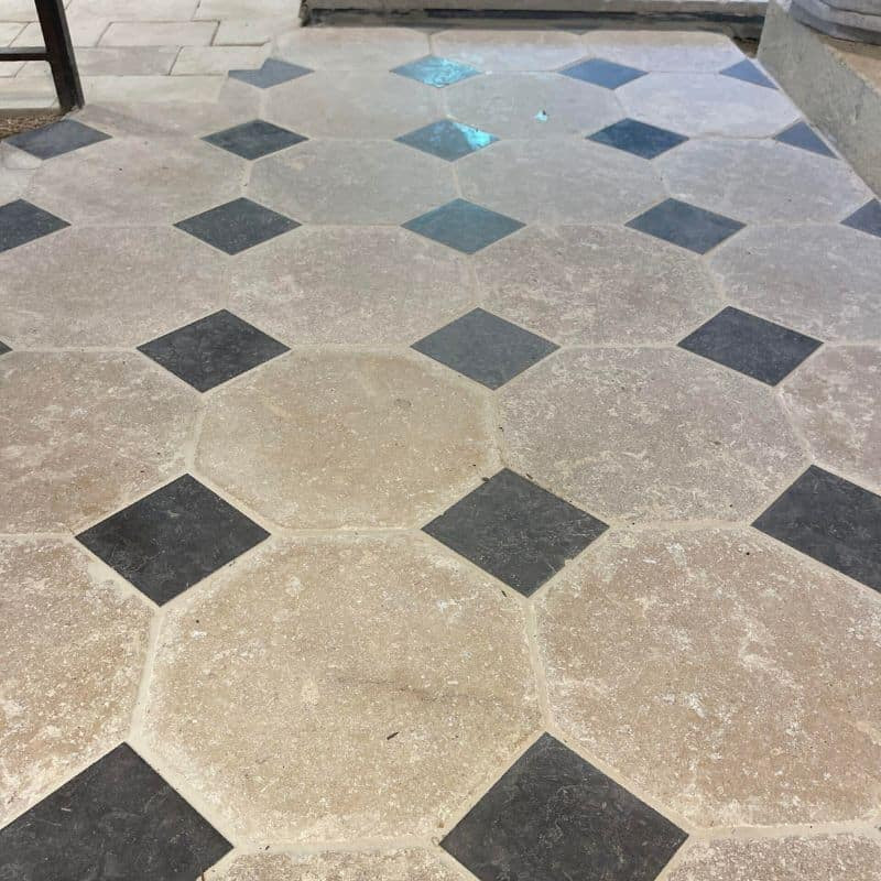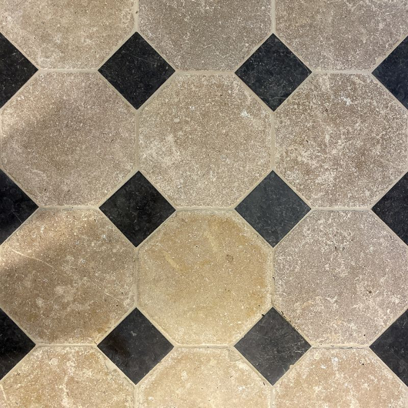 En vous proposant ce dallage en pierre naturelle, Ligerio vous assure un produit de qualité pour votre intérieur. Les cabochons de ce dallage sont taillés en Espagne et les dalles le composant proviennent du Sud-Est de la France. Comme tous les dallages à cabochons, la grande dalle octogonale est reliée par des petites dalles carrées dans chaque coin. Doté d’une finition “adoucie” ce dallage, à une surface lisse ayant quelques aspérités¹. Chics et élégants, les dallages à cabochons offrent de multiples possibilités d’aménagement ! Le dallage à cabochons Toscane permettra d’apporter un côté chic et élégant aux pièces de votre maison. Idéal dans un salon, nous vous invitons aussi à le poser dans une cuisine, dans une entrée ou une chambre. De plus, ce dallage est compatible avec le chauffage au sol. Ce dallage en pierre naturelle à teinte beige permet de rendre plus chaleureuse les pièces de votre maison et ravivera le charme de votre intérieur ! À souligner, ce dallage est également approprié pour une utilisation en extérieur en raison de sa résistance au gel. Pour rajouter du cachet à votre dallage en cabochon, optez pour une pose avec bandeau périphérique. Envie d'un dallage à cabochons plus abordable et tout aussi qualitatif ? Découvrez notre dallage à cabochons en travertin.QUELLES SONT LES DIMENSIONS DU DALLAGE À CABOCHONS TOSCANE ?
