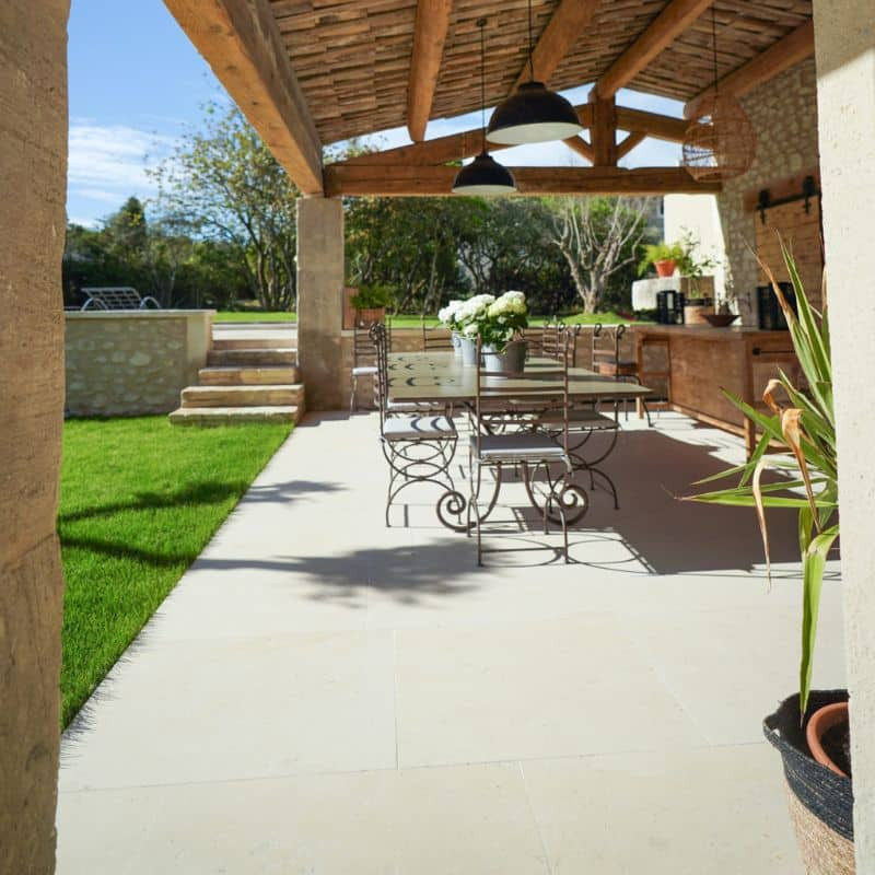 beige clair à blanchâtre apporte une touche de luminosité et d’élégance à vos espaces extérieurs. De plus, il s’intègre harmonieusement dans de nombreux styles architecturaux. Par ailleurs, la pierre étant un