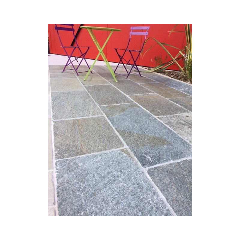 Ce dallage en pierre de Luzerne comprend une dimension:- 40 cm de large pour 2 cm à 5 cm d'épaisseur.