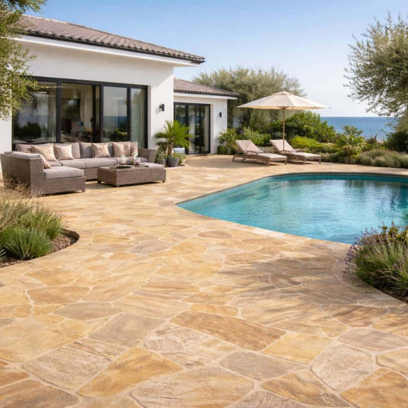 Enfin, ce dallage en quartzite apporte luminosité et élégance à vos extérieurs, pour un aménagement à la fois esthétique et durable.