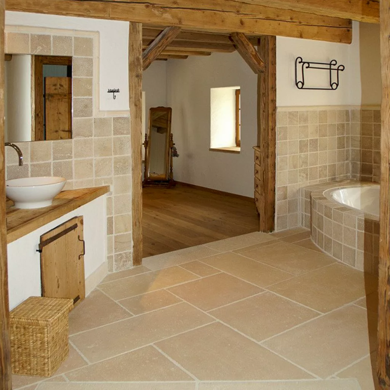 extérieur. Salle à manger, salon, chambre, cuisine ou terrasse, à vous de choisir. Tout est possible ! Afin de faire ressortir le charme ancien de ce dallage, les bords sont épaufrés ¹ pour un rendu encore plus authentique. Tout comme notre