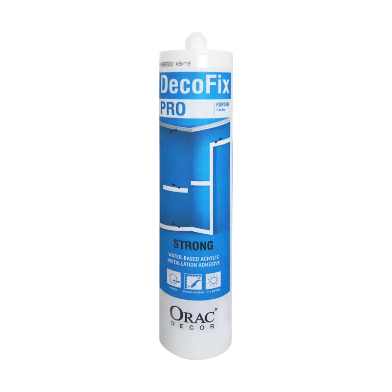 Decofix Pro : colle forte pour pose de cimaises, corniches et parements muraux en intérieur. Uniquement pour surfaces poreuses ET pièces non humides.