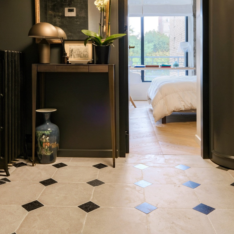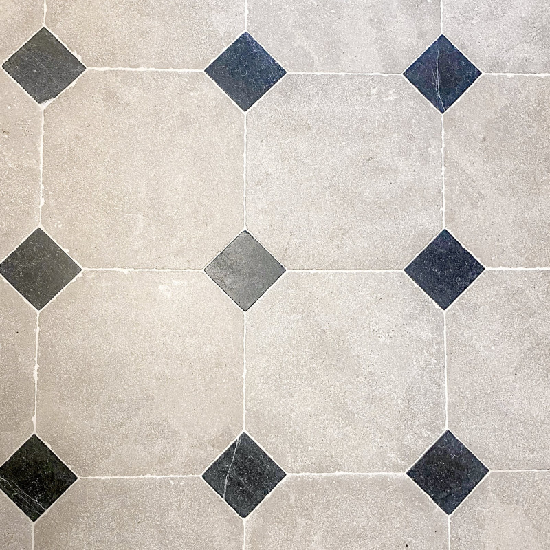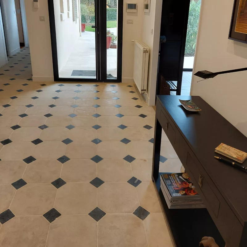 Ce grand dallage à cabochons est composé de dalles octogonales et de cabochons en pierre bleue. Appartenant à la famille des pierres dures, cette dernière est semblable au marbre. Les cabochons associés sont en pierre bleue. Les dalles octogonales, quant à elles, sont en pierre calcaire naturelle, pour une authenticité accrue. Taillé à partir de pierres de calcaire extraites, ce dallage de qualité vous offrira de nombreux avantages grâce à sa durabilité et sa facilité d’entretien. Pour un rendu plus naturel, les finitions ont été vieillies et les arêtes épaufrées¹. Il se mariera aussi bien avec les décors anciens que modernes. Entrée, couloir, salon ou cuisine, à vous de choisir ou le poser ! Vous trouverez également chez Ligerio un dallage à cabochons Poillé. Ces deux matériaux offrent un rendu similaire. Néanmoins, la pierre reconstituée est disponible à un tarif plus abordable. Pour parfaire la pose d’un grand dallage à cabochon, adoptez notre bandeau de pierre calcaire sur le contour de la pièce. Découvrez également notre dallage à cabochons noirs.QUELLES SONT LES DIMENSIONS DU GRAND DALLAGE À CABOCHONS ?