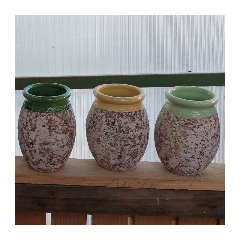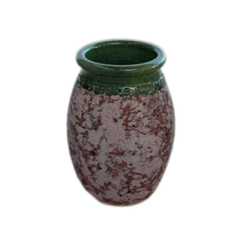 Le col de cette jarre est vert traditionnel. D'autres version sont disponibles : ivoire, jaune, miel, bleu traditionnel, noir satiné, rouge coquelicot, vieil email, vieil émail antique, silver, pastel, vert de gris, vert amande et rose calamine. Le col de cette jarre est émaillé selon la méthode artisanale utilisée pour les vases d'Anduze. Cet émaillage résiste également au gel. Cette jarre brille par son authenticité et son élégance. Ce produit étant très contemporain, il ne risque pas de passer inaperçu. Photos non contractuelles, la fabrication artisanale fait que la teinte du produit peut varier. Cette jarre méditerannéenne est disponible en plusieurs dimensions :