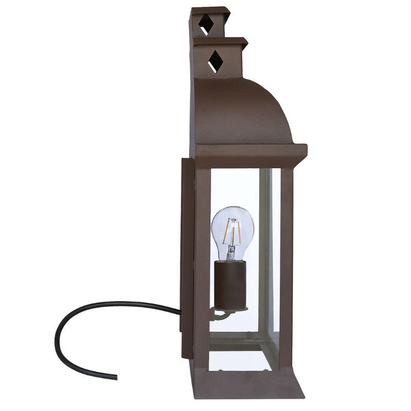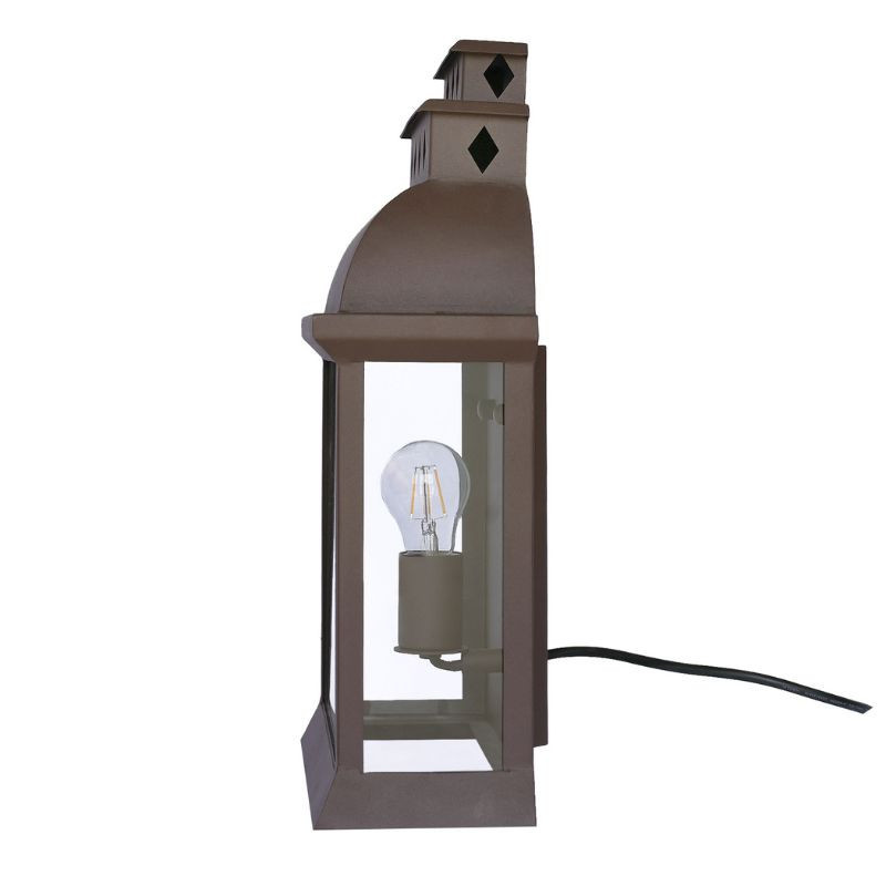 Cette petite lanterne murale en fer thermolaquée est durable, sobre et neutre. Elle se fondra dans n'importe quel type de décor ! Cette petite lanterne murale est constituée de fer thermolaqué, une matière très résistante. Qu'il pleuve, qu'il vente ou qu'il neige, elle gardera son aspect original et ne subira pas de corrosion. La peinture (sous forme de poudre) de ce produit ne contient pas de solvants et a été appliquée par le biais d'un pistolet électrostatique. Ainsi, elle est plus durable, dans le sens technique comme écologique du terme. Les dimensions de cette lanterne sont de 46 cm de hauteur pour une largeur de 33 cm et une profondeur de 14 cm. C'est modèle relativement petit et discret, qui contient de quoi installer une seule ampoule. De même, sa décoration est assez sobre, elle est seulement agrémentée de quelques losanges sur le haut de la lanterne. Ainsi, cette lanterne pourra s'intégrer dans n'importe quel type de décor, du plus moderne au plus traditionnel. Cette lanterne murale convient aussi bien à l'intérieur qu'à l'extérieur. Son style classique et élégant donnera un joli ton à votre espace. C'est aussi une excellente idée cadeau !