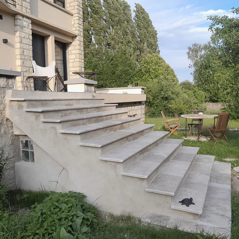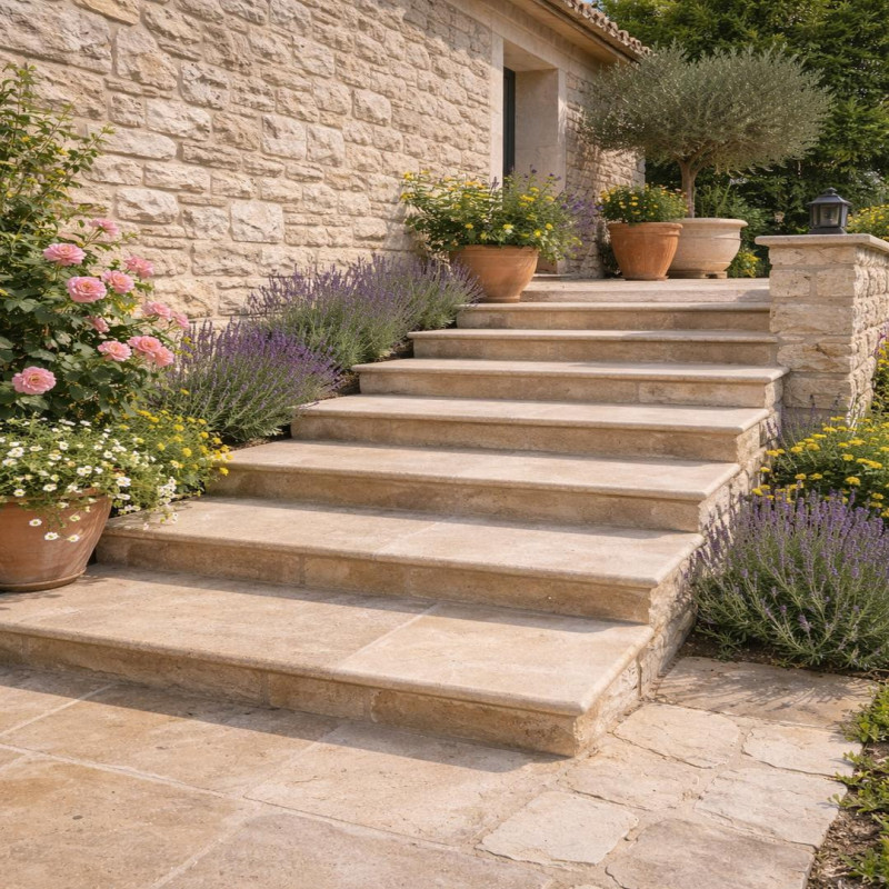 Enfin, grâce à leur façade arrondie, leur résistance au gel et leur parfaite adaptation à l’extérieur, nos marches en travertin allient charme naturel et durabilité pour valoriser tous vos aménagements.