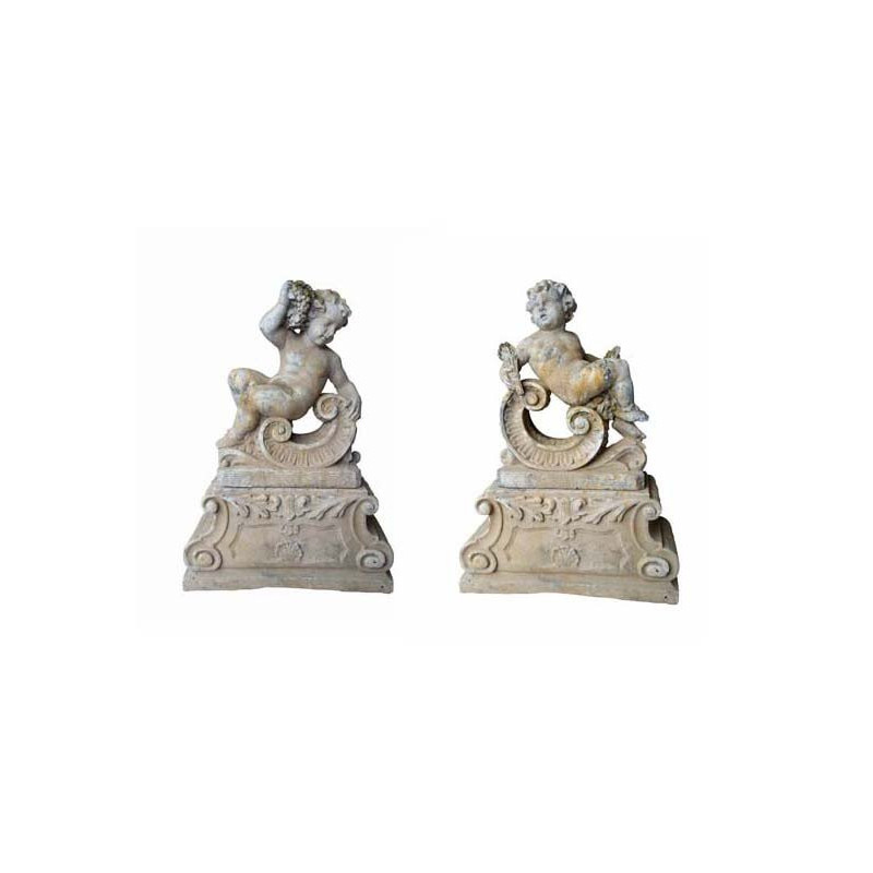 Découvrez cette paire de putti : deux magnifiques statues sur le thème de l'été et de l'automne. Ce lot contient deux statues assorties : un putto d'automne, ainsi qu'un putto d'été. Les putti, également appelés chérubins, ou angelots, sont des un enfants nus. La première statue représente l'automne, c'est une réédition de putto aux raisins. La deuxième statue, plus estivale, est une magnifique représentation de putto aux blés.
