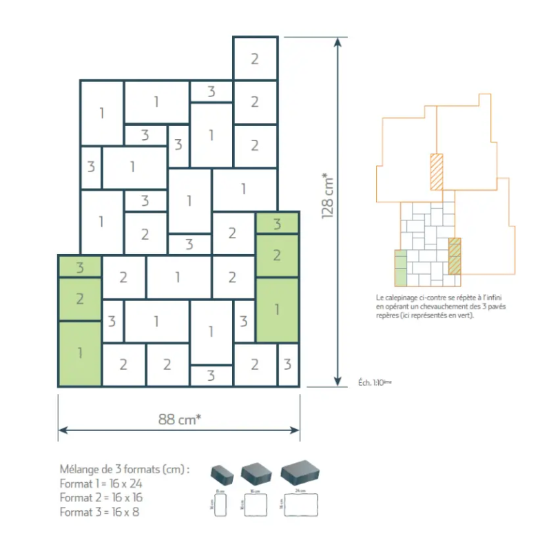 Ligerio vous offre la possibilité de choisir les dimensions ! Grâce au sur mesure, laissez libre cours à votre imagination et adaptez ce dallage à votre habitation. Projetez vous plus facilement en choisissant une option pour voir les photos des formats. Nous vous proposons également plusieurs formats standards, pour correspondre au mieux à vos besoins. Les dimensions du format carré :- 12 cm de longueur x 12 cm de largeur x 3 cm d'épaisseur