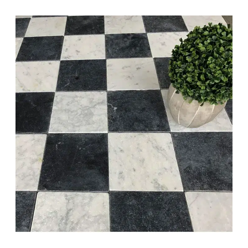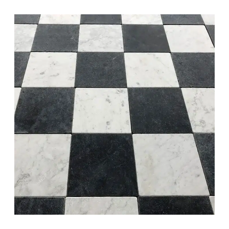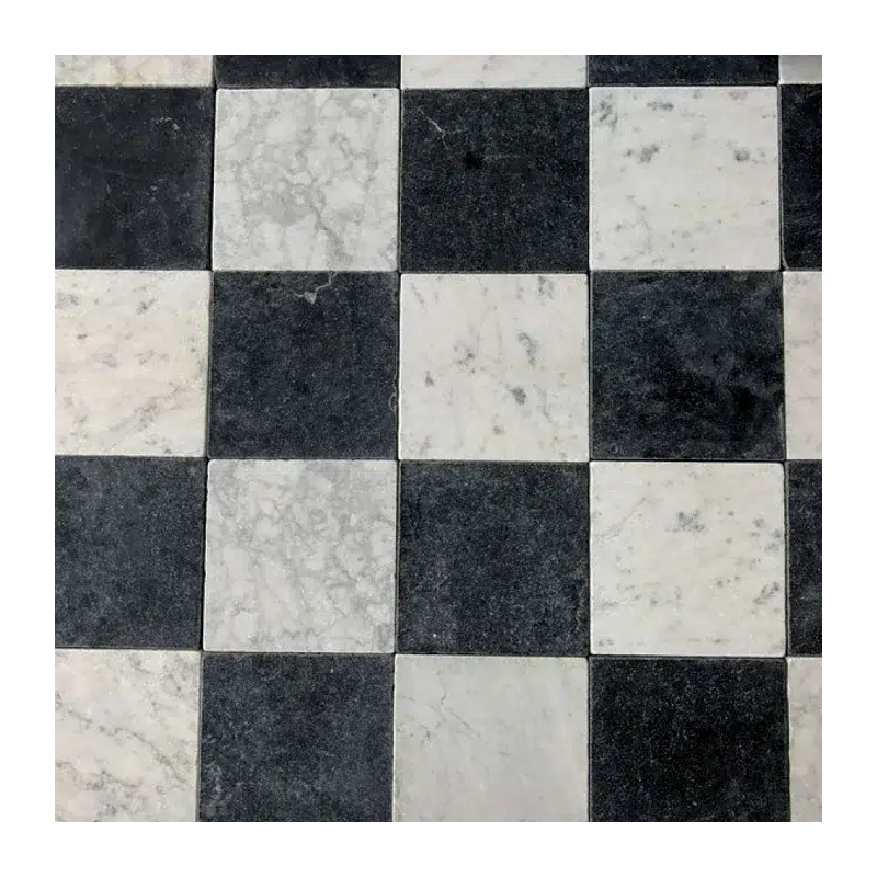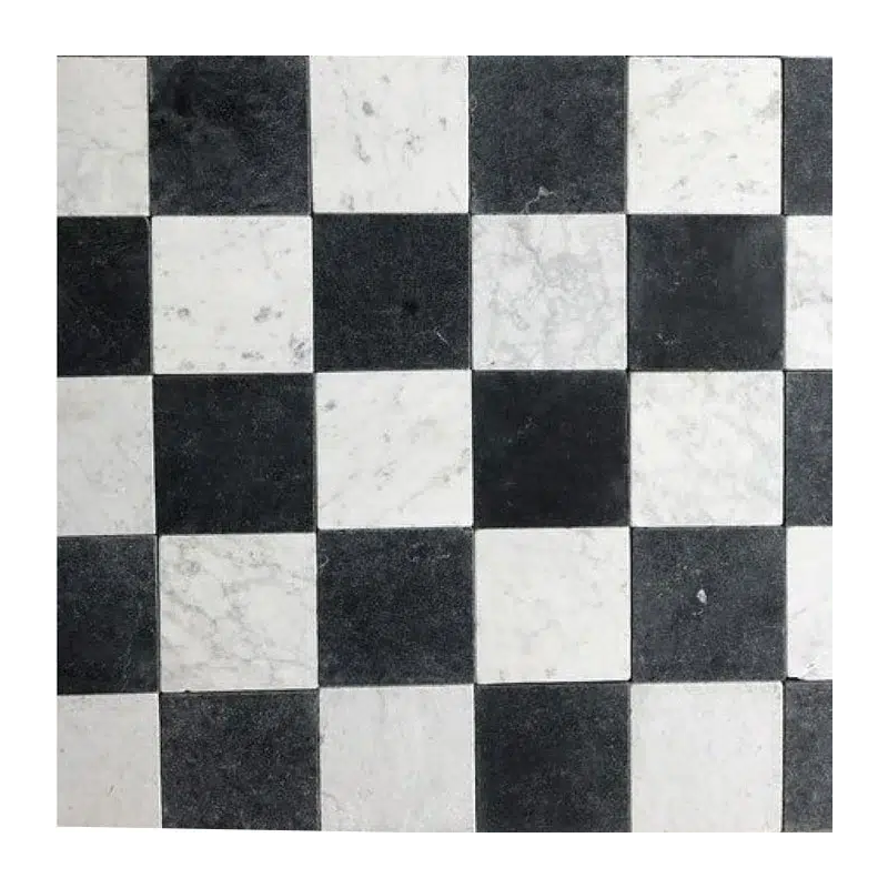 À la recherche d’un revêtement de sol esthétique et authentique ? Parmi tous nos dallages, vous trouverez nos authentiques dallages noirs et blanc, aussi appelés "dalles à damier". Les dallages à damier comptent parmi les dallages les plus qualitatifs proposés par Ligerio. Découvrez notre réédition de dallage à damier du XVIIᵉ siècle : le petit dallage à damier fabriqué au Maroc. Ce petit dallage à damier est composé de carreaux blancs en marbre et de carreaux noirs en pierre bleue. Afin d’accentuer son caractère unique, les bords des carreaux sont dotés d’une finition vieillie. Fabriqué en marbre vieilli, cette pierre naturelle offre beaucoup d’avantages. Cette matière unique, noble et très robuste, conférera beaucoup de charme et de raffinement à votre intérieur. Chambre, cuisine, entrée ou salle de bain, à vous de choisir ! Ce revêtement pour sol et mur intemporel et conférera un caractère unique à vos pièces. Plusieurs types de poses s’offrent à vous. Vous pouvez choisir de poser votre dallage en tant que revêtement de sol ou en carrelage mural. Ce petit dallage en damier noir et blanc vous permettra de jouer avec la profondeur de vos pièces. Au sol, utilisez-le en tapis de carrelage pour délimiter les espaces de votre habitation. Au mur, osez créer des cadres de mosaïques en délimitant par exemple les contours d’un miroir. Il est à noter que ce dallage s'harmonise également avec un système de chauffage au sol tout en présentant une résistance au gel. Une préférence pour les grands carreaux ? Le dallage à damier marbre est fait pour vous.QUELLES SONT LES DIMENSIONS DU PETIT DALLAGE A DAMIER NOIR ET BLANC ?