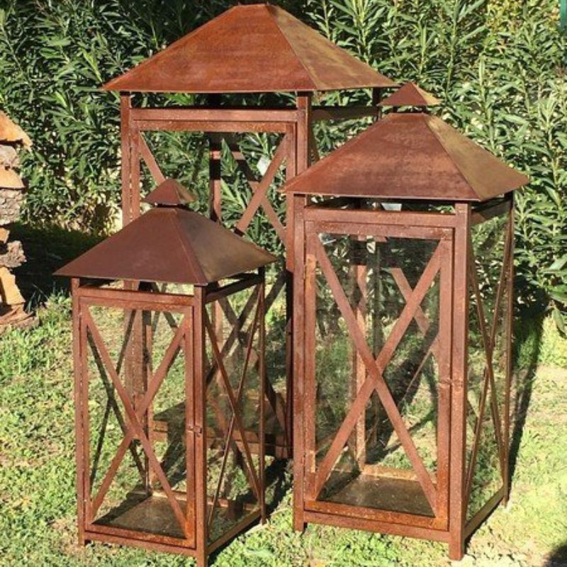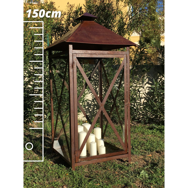 Massif et élégant, ce photophore géant ne risque pas de passer inaperçu. Cette lanterne est fabriquée en fer patiné effet rouille, il s'agit d'un fer thermolaqué solide et durable. C'est grâce à une peinture en poudre (chargée positivement) qui a été pulvérisée sur le fer (chargé négativement) avec un pistolet électrostatique que cette peinture tient si bien. Elle ne se détériorera pas et ne craint pas la corrosion. Les intempéries n'ont aucun effet sur cette lanterne. Bien qu'aillant une couleur rouille, cette lanterne n'est pas véritablement rouillée et ne peut pas l'être dans le temps. Ce photophore en métal allie parfaitement élégance et sobriété. Elle est simple et efficace : son aspect vieilli et industriel saura se fondre dans beaucoup de décors. C'est un très grand modèle qui ne risque pas de passer inaperçu. Elle peut servir à mettre en valeur un chemin, un escalier, une entrée, ou simplement une partie de votre jardin.
