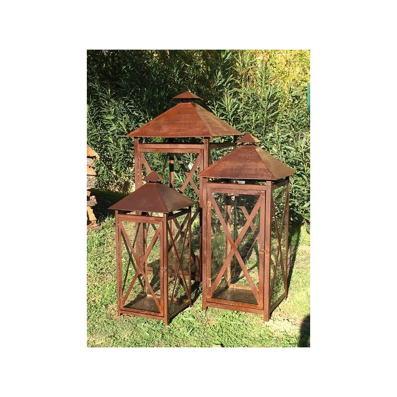 Massif et élégant, ce photophore géant ne risque pas de passer inaperçu. Cette lanterne est fabriquée en fer patiné effet rouille, il s'agit d'un fer thermolaqué solide et durable. C'est grâce à une peinture en poudre (chargée positivement) qui a été pulvérisée sur le fer (chargé négativement) avec un pistolet électrostatique que cette peinture tient si bien. Elle ne se détériorera pas et ne craint pas la corrosion. Les intempéries n'ont aucun effet sur cette lanterne. Bien qu'aillant une couleur rouille, cette lanterne n'est pas véritablement rouillée et ne peut pas l'être dans le temps.
