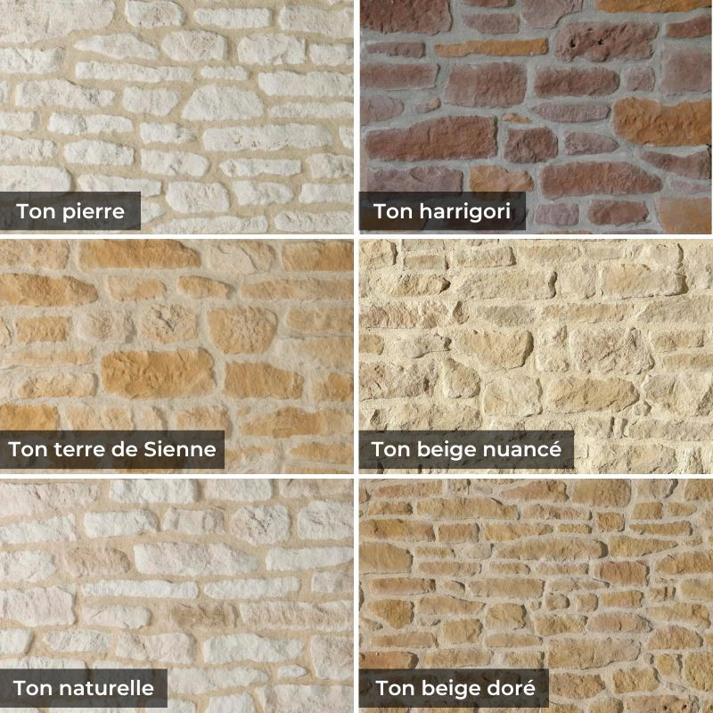 | Teinte des pierres | Variations de teinte | Couleur du joint conseillée | Teinté dans la masse | Aspect de la pierre | |