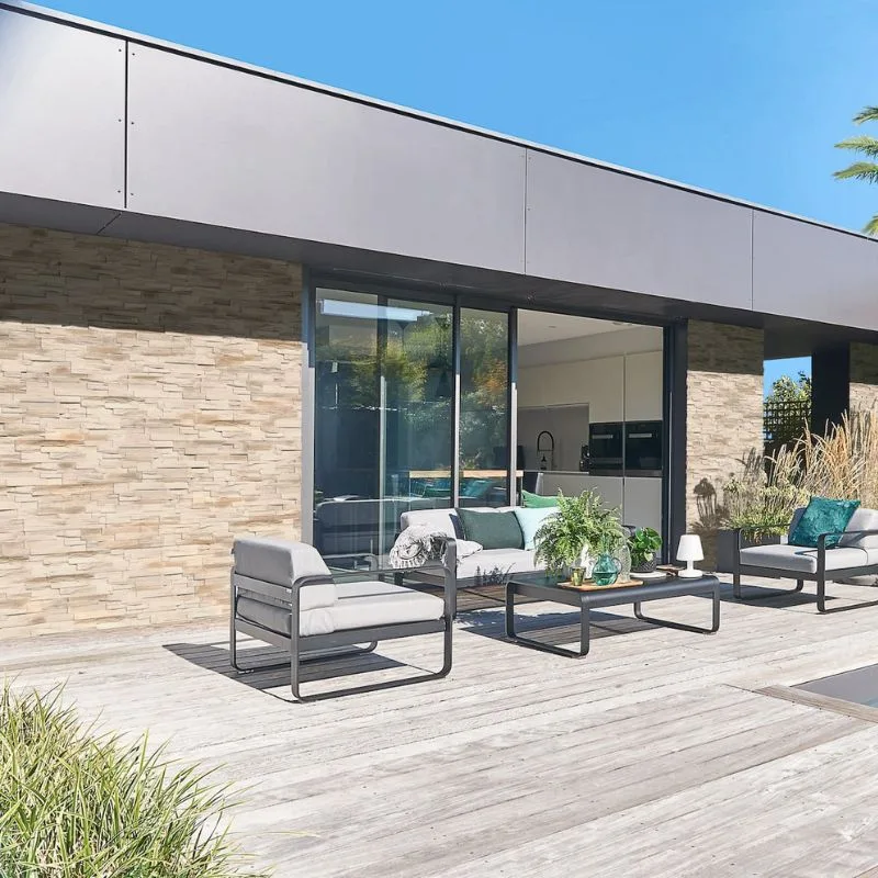 De fabrication française, le parement Gaïa est composé de pierres sciées aux formes géométriques, créant une esthétique moderne et structurée. Sa pose est particulièrement simple : il suffit de coller et positionner les plaques avant de procéder au jointoiement.