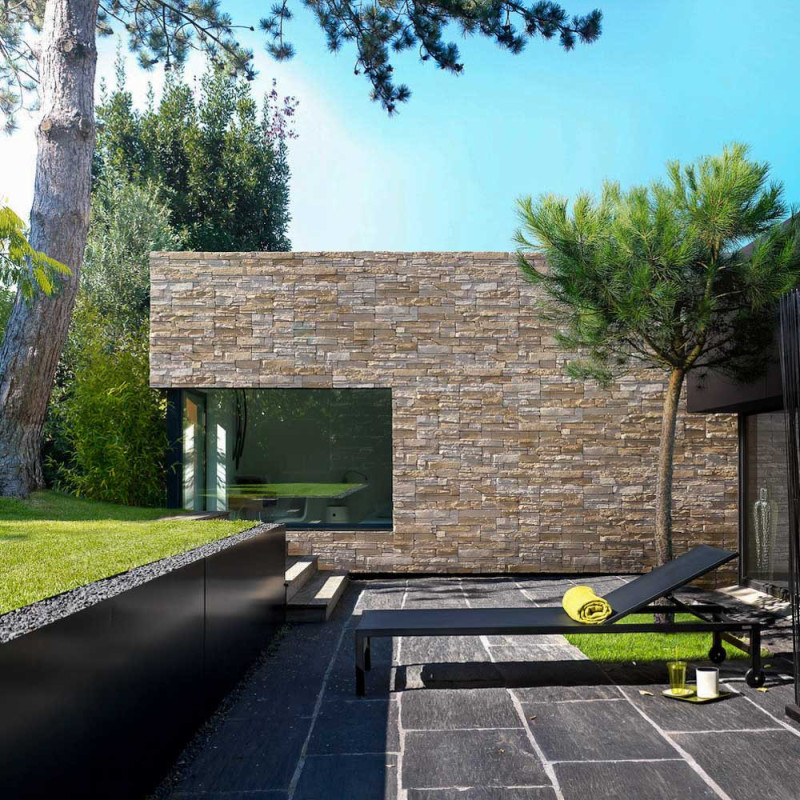 Grâce à son format et à son esthétique minérale, ce parement se marie parfaitement avec une grande variété de matériaux : béton, métal, bois, verre… Il s’intègre aussi bien dans un espace intérieur qu’extérieur, et convient même aux pièces humides comme la salle de bains ou la cuisine, offrant ainsi une multitude de possibilités décoratives.