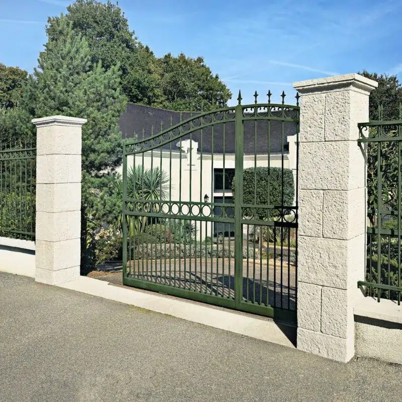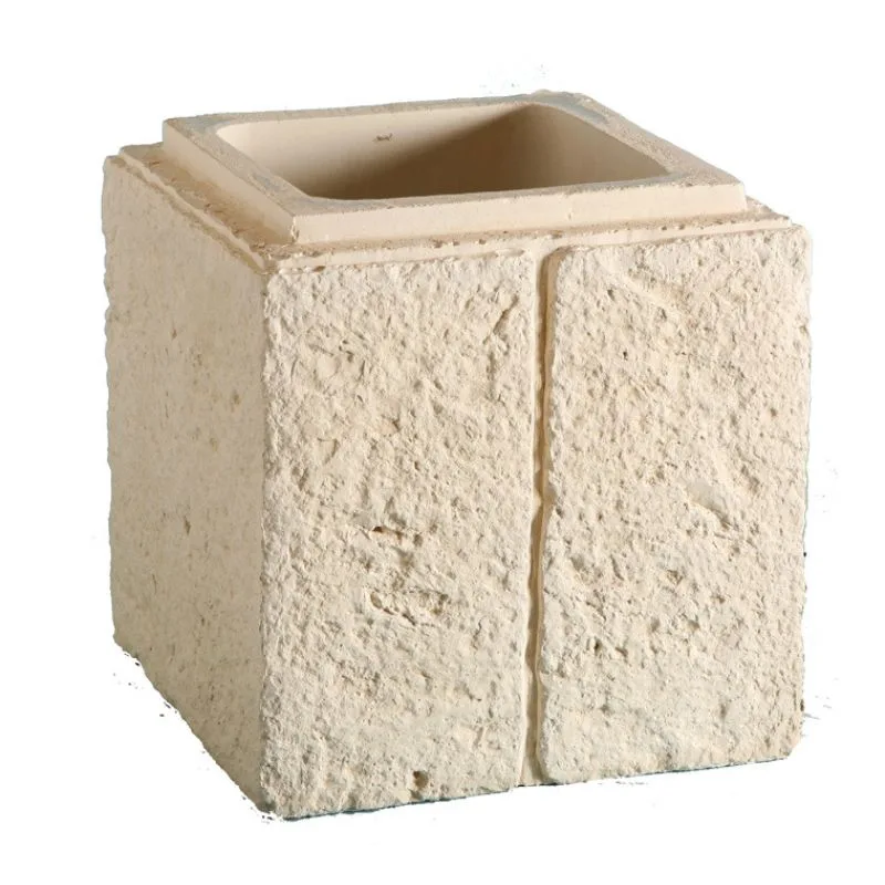 Afin d’obtenir une pose durable et sans encombre pendant des années, nous vous conseillons de creuser une fondation pour chaque pilier d’environ 50 cm de profondeur et 10 à 15 cm de plus que la largeur du pilier. Mettre la fondation hors gel en adaptant sa profondeur à la nature du terrain et au climat de la région. Positionner des fers tors de diamètre 10mm dans la fondation. Les barres de fer tors doivent avoir une hauteur égale à la profondeur de la fondation + la hauteur du pilier sans chapeau. Laissez sécher la fondation pendant un minimum de 48 heures avant d’entamer la pose des piliers. Placez les boisseaux un à un (bavette d’emboîtement vers le haut) sur une hauteur de 90 cm. Disposez le film de mousse polyéthylène (kit de protection) sur le pourtour des parois intérieures du pilier de bas en haut. Ce film évitera d’éventuelles micro fissures. Remplir le pilier de béton à raison d’une hauteur maximum de 1 mètre linéaire / 24 heures et tasser légèrement le mélange à l’aide d’un bâton. Une fois tous les étages montés, il ne vous reste plus qu’à couronner le pilier en posant le chapeau en utilisant du mortier colle. Pour une étanchéité renforcée, un joint de mastic polyuréthane en cartouche peut être déposé sur le contour intérieur des boisseaux pour éviter toute trace de laitance. Nous vous conseillons d’appliquer un hydrofuge sur le pilier une fois installé pour le protéger de l’humidité.