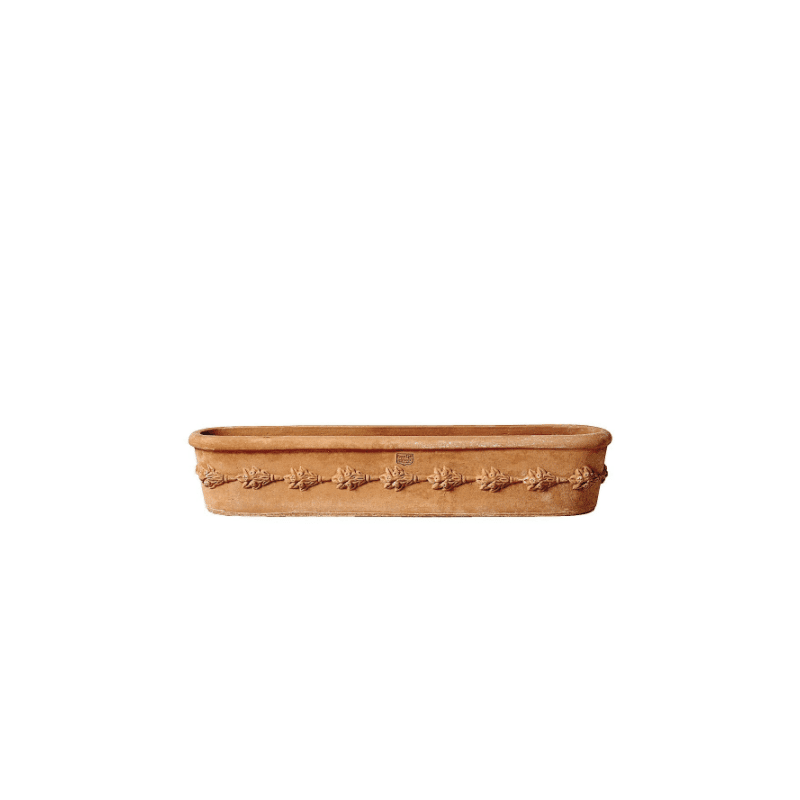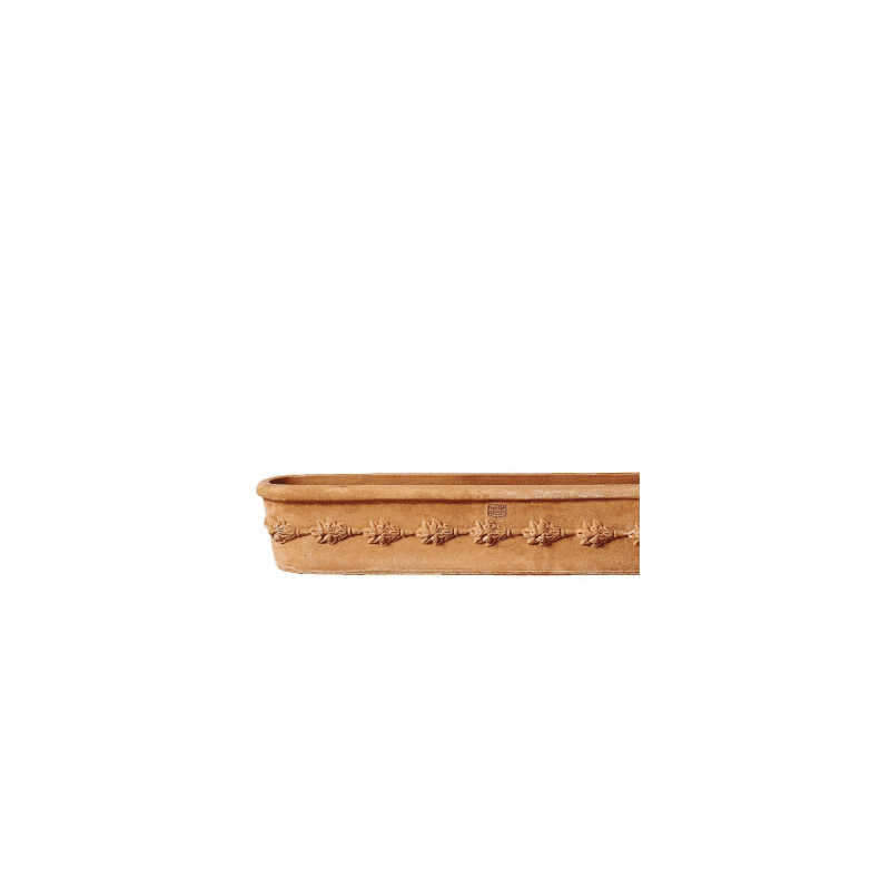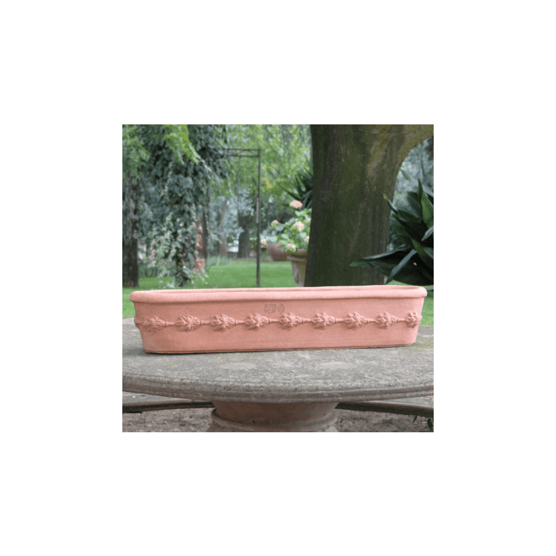 Ce pot rebord de fenêtre classique apportera de l'élégance et de la sobriété à votre jardin. Travaillé à la main par nos artisans italiens à partir d'argile d'Impruneta, ce vase est de très bonne qualité. Résistant aux vents, au gel et aux températures allant jusqu'à -30 °C, vous pourrez l'exposer à l'intérieur tout comme à l'extérieur sans risque. Ce vase original peut être utilisé comme rebord de fenêtre ou être disposé en décoration sur une table. Celui-ci est décoré par des fleurs en relief sur toute sa surface qui lui apporte de l'élégance. Ce pot ira parfaitement avec une décoration classique. Avec le temps, ce pot en terre cuite ne changera pas de forme et acquerra une très belle couleur.