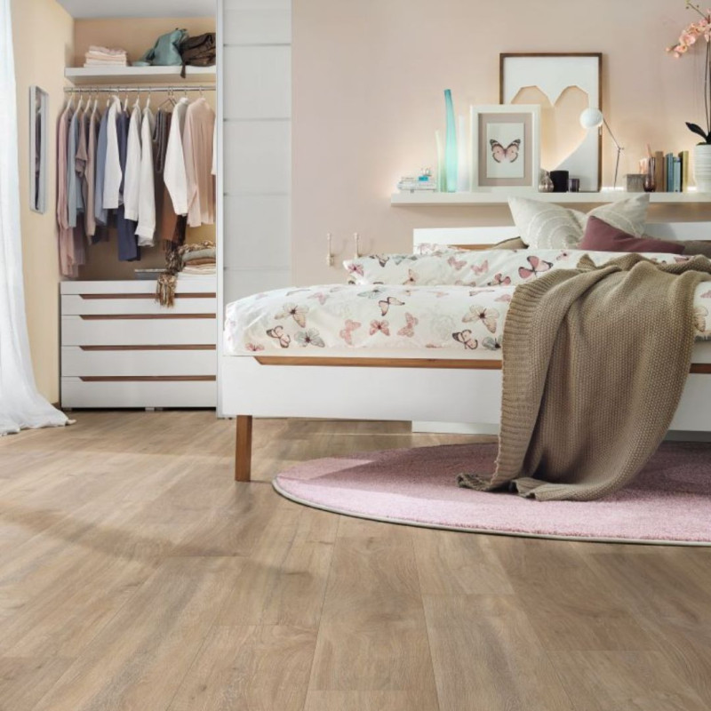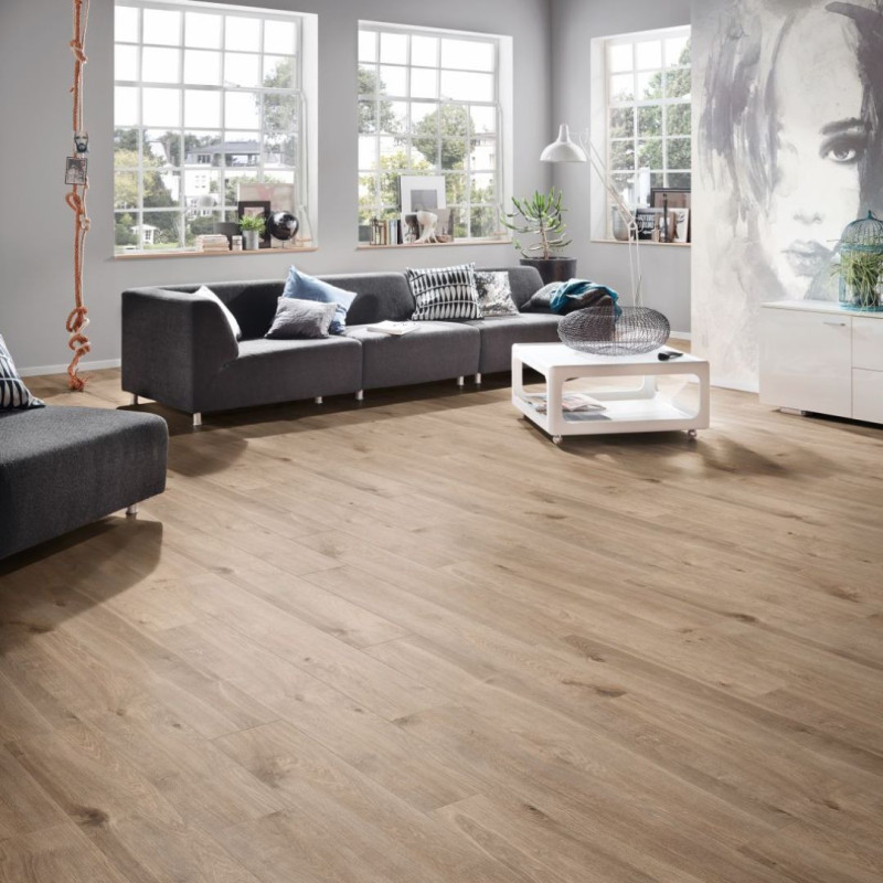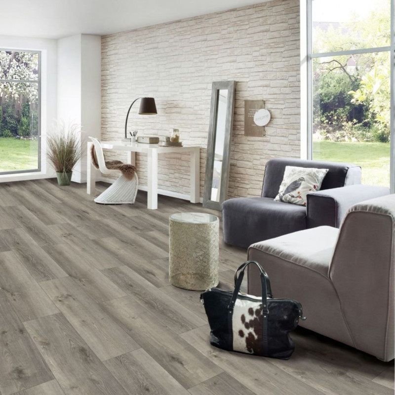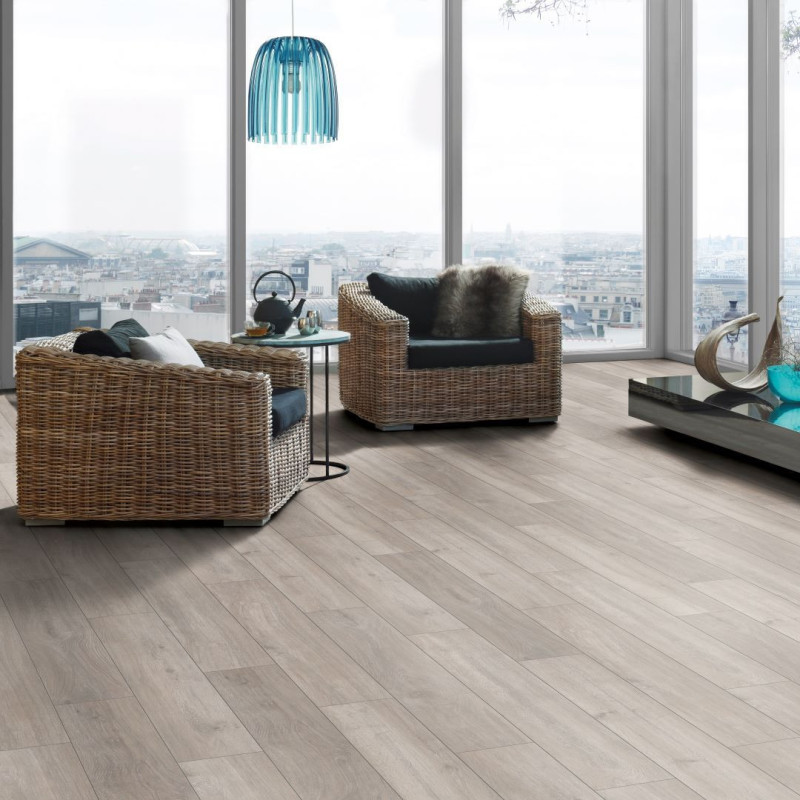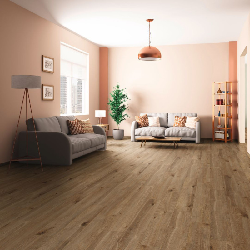 Le sol stratifié apporte de nombreux avantages de par sa composition et son rendu esthétique. La couche d'âme en fibre de bois, lui apporte sa densité et de ce fait un confort acoustiques et une bonne isolation. Quant à la couche d’usure, de décoration, elle est composée de cellulose spéciale imprégnée de résine, ce qui confère au stratifié sa robustesse et l'effet visuel recherché. La résistance AC5, la plus élevée dans sa catégorie, confère une protection supplémentaire à ce sol stratifié imitation bois. Associée à une épaisseur de 10 mm, cette caractéristique garantit une résistance exceptionnelle contre l'usure, les impacts et les éraflures. Idéal pour les espaces à trafic élevé, notre sol stratifié 10 mm offre une durabilité supérieure, assurant une grande longévité sans compromis sur l'esthétique. De plus, la résistance à l'humidité de ce revêtement de sol en stratifié imitation bois le rend adapté aux zones sujettes à une exposition modérée à l'eau comme les cuisines. Le design minutieusement travaillé de l'imitation bois de chêne crée une atmosphère chaleureuse et sophistiquée. Les détails authentiques du grain de bois, les variations de couleur et les textures réalistes ajoutent une touche naturelle à votre espace, révélant un sol qui capture la beauté du bois véritable. Que vous recherchiez une ambiance rustique ou contemporaine, ce revêtement de sol stratifié offre une polyvalence stylistique exceptionnelle. Si vous souhaitez un sol stratifié avec une épaisseur moins importante, nous vous proposons le sol stratifié 8 mm aspect bois ou encore le sol stratifié 7 mm effet bois.Les variations disponibles pour ce sol stratifié imitation bois