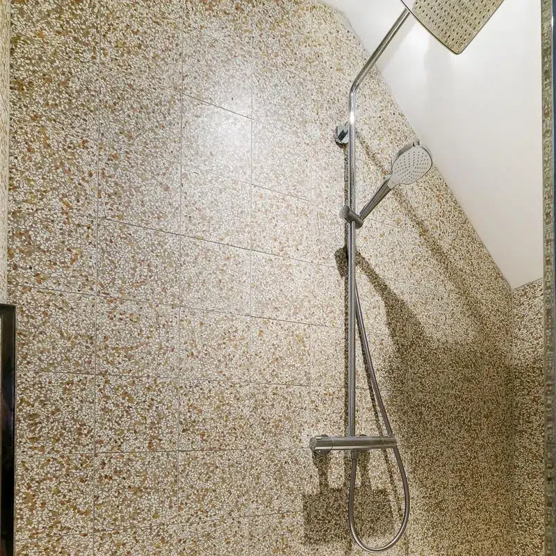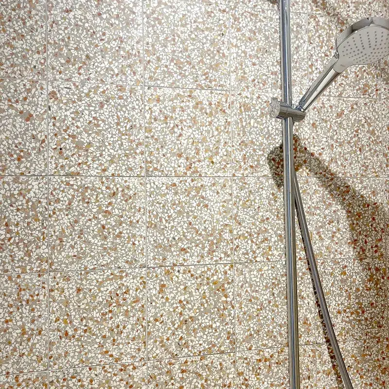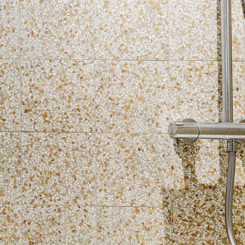 Autrefois considéré comme un produit bas de gamme, il est aujourd’hui très à la mode ! Le terrazzo « haut de gamme » est un produit élégant, décoratif et coloré qui offre la possibilité de le poser dans les zones de grands passages, telles qu’une salle de bain, un hall d’entrée, une cuisine ou encore un salon. Les teintes dominantes de ces carreaux de ciment sont le blanc et des nuances de marron. Ce Terrazzo italien d’une épaisseur de 2 cm ou de 2,5 cm est disponible en deux formats :- 20 cm x 20 cm x 2 cm