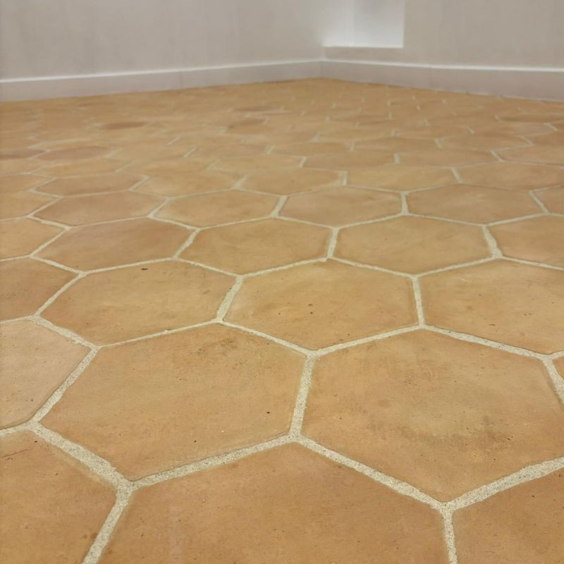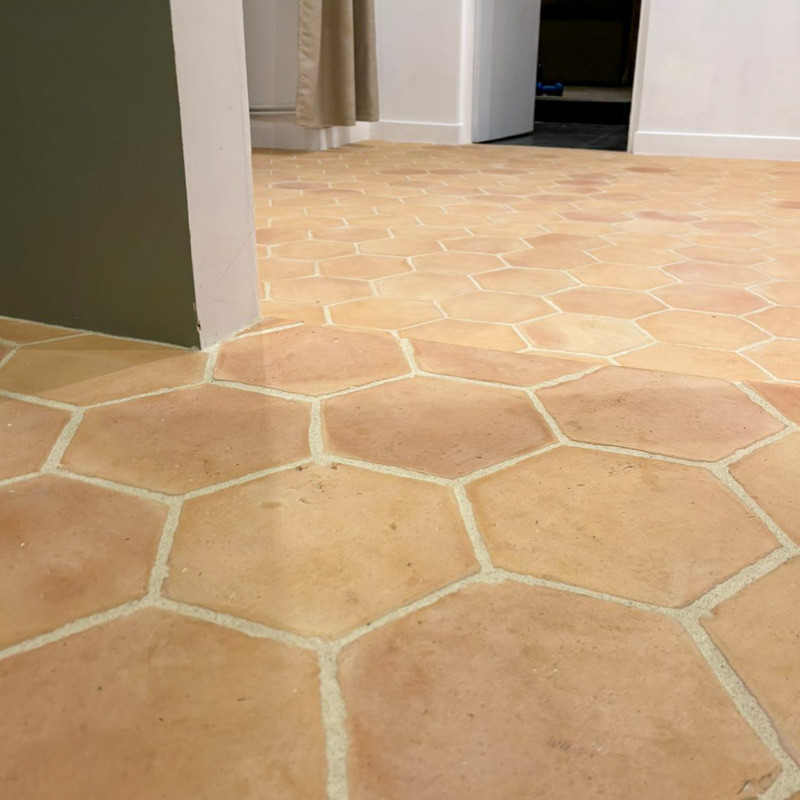La tomette hexagonale constitue un revêtement de sol intemporel. Elle s’intègre aussi bien dans un salon que dans une cuisine ou une entrée.