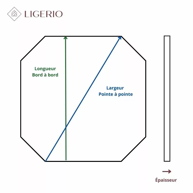 Nous mesurons les dimensions de bord à bord, et non de pointe à pointe. Pour mieux comprendre ce point, consultez le schéma explicatif disponible dans les photos du produit.
