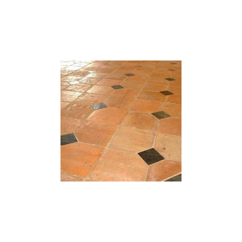 tomettes anciennes, les pans sont recoupés afin d’intégrer des cabochons en ardoise. Les