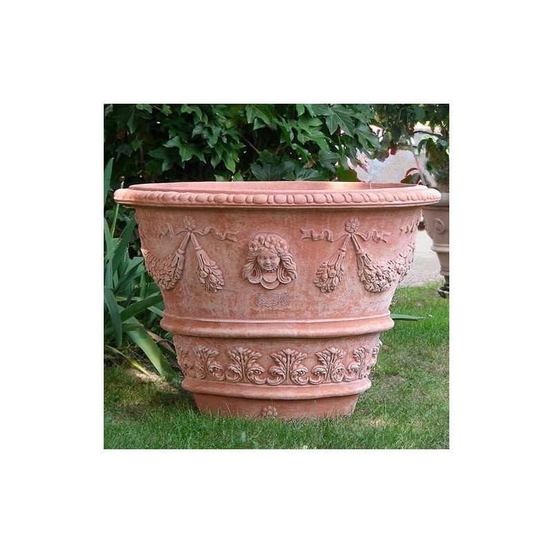 Ce vase exceptionnel en terre cuite de style “Médicis” est 100% fabriqué à la main en Italie. Son décor d’une grande richesse est typique du style de décors que l’on voit sur les vases dans les palais florentins. Fabriqué à partir de terres extraites à proximité de l’atelier et cuit selon une méthode dont seul l’artisan Poggi Ugo a le secret, ce vase ancien en terre cuite est garanti contre le gel jusqu’à -30°C à condition que le fond du vase soit bien drainé par une couche de cailloux et que l’eau n’y stagne pas. Ce vase est une reproduction d’un vase de style “Médicis”. Ce style de vase qu’il soient en bronze, en pierre ou en terre cuite se sont fortement répandus en Italie puis en Europe à partir de la Renaissance. Ce vase de grande taille en terre cuite mesure 68 cm de hauteur pour un diamètre de 80 cm.