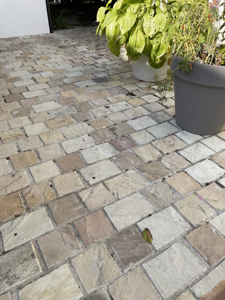 Plusieurs dimensions ont été mélangées (14x14 et 14x20) afin d'obtenir de la dimension et un rendu encore plus naturel. Ce pavé extérieur est idéal pour cet espace. En effet, ce revêtement de sol est particulièrement robuste, résiste au gel et est antidérapant.