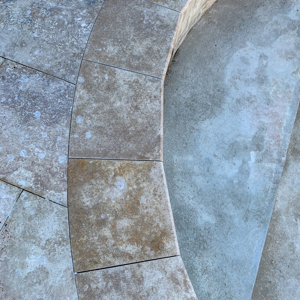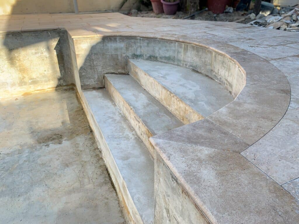 Ici, le travertin est utilisé pour l'entourage de la piscine avec des margelles de 120 cm de long et des margelles de 60 cm de long. Comme vous pouvez le voir sur les photos, ces margelles de piscine peuvent convenir pour un escalier roman : celles-ci sont recoupées pour ajuster leurs dimensions à la surface. Le travertin est une pierre relativement résistante, vous permettant de la recouper à votre convenance.