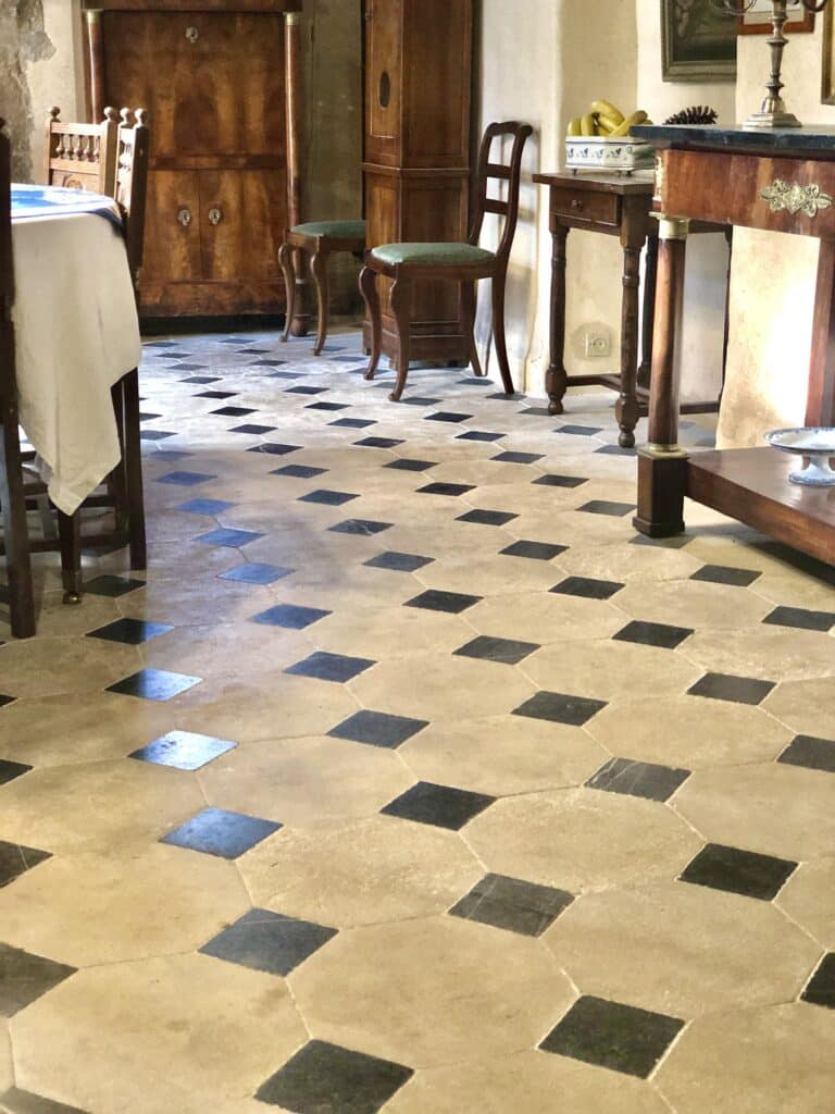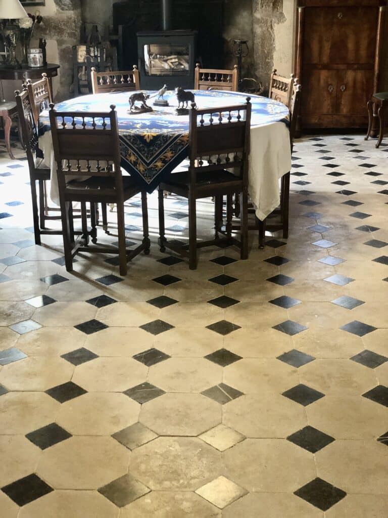 Les propriétaires de ce joli manoir ont choisi le Dallage à cabochons classique ainsi que le Parquet Berrichon pour rénover les sols de leur demeure.