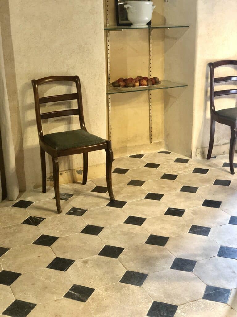 Le Dallage à cabochons est si bien posé que nous avons l'impression qu'il a toujours été dans ce manoir ! Aucun joint n'a été fait pour cette pose, pour une question de goût. Ce dallage est présent dans l'entrée ainsi que dans la salle à manger et dans la salle de bain. Il est en parfaite adéquation avec l'esprit du manoir !